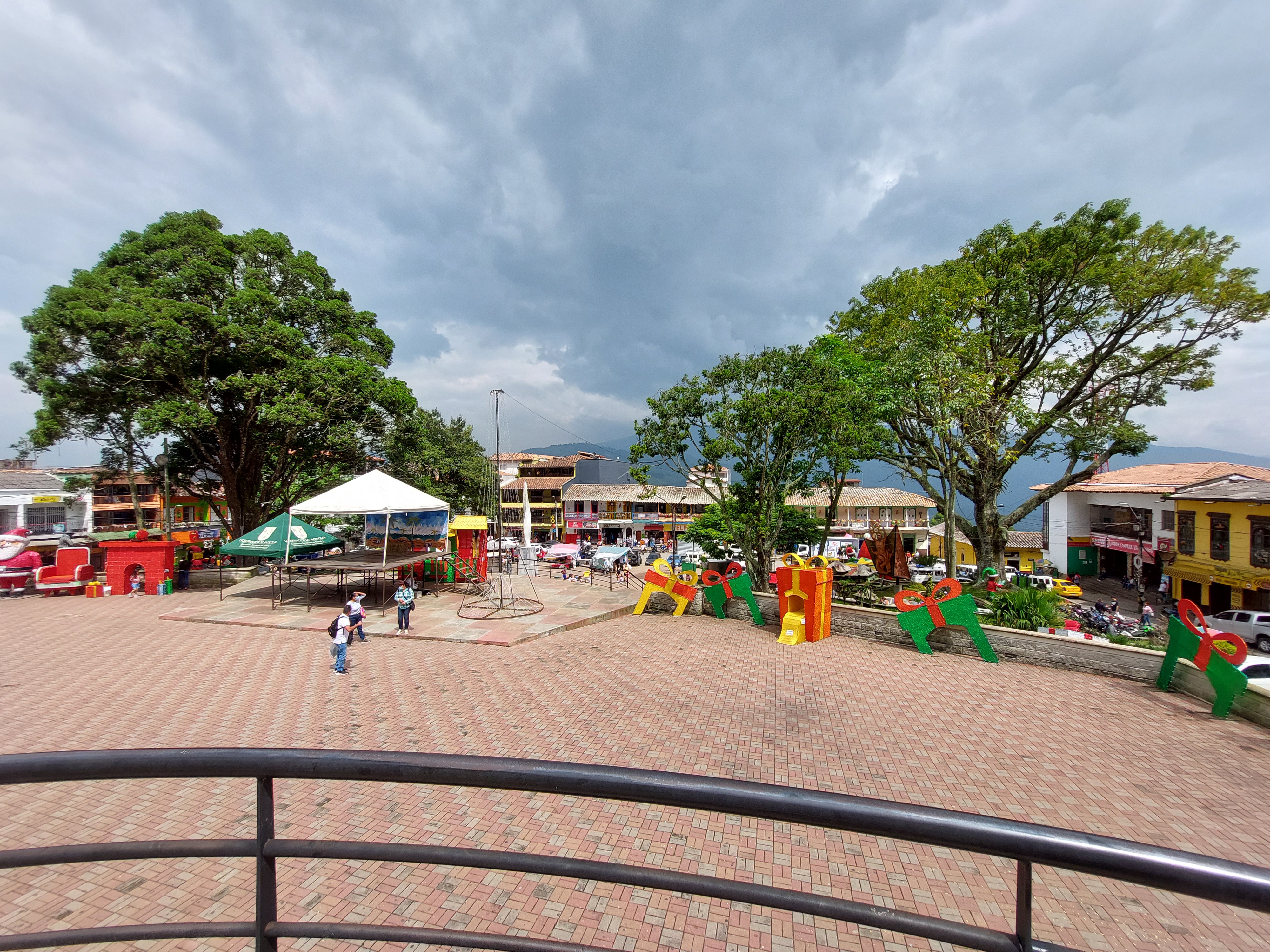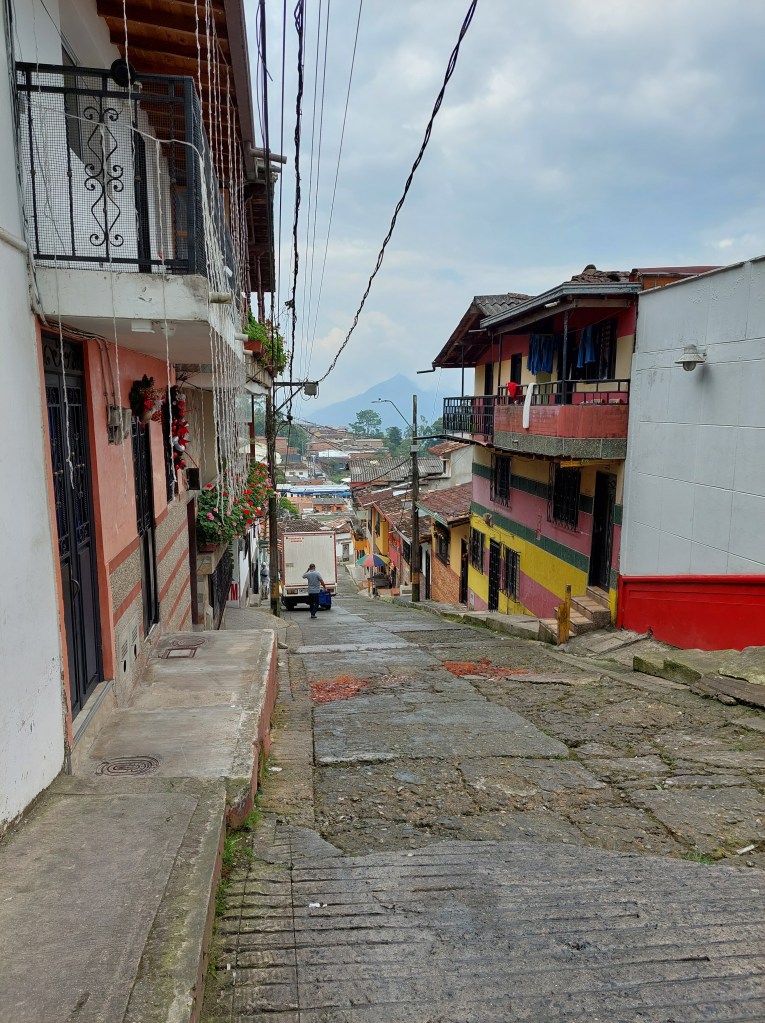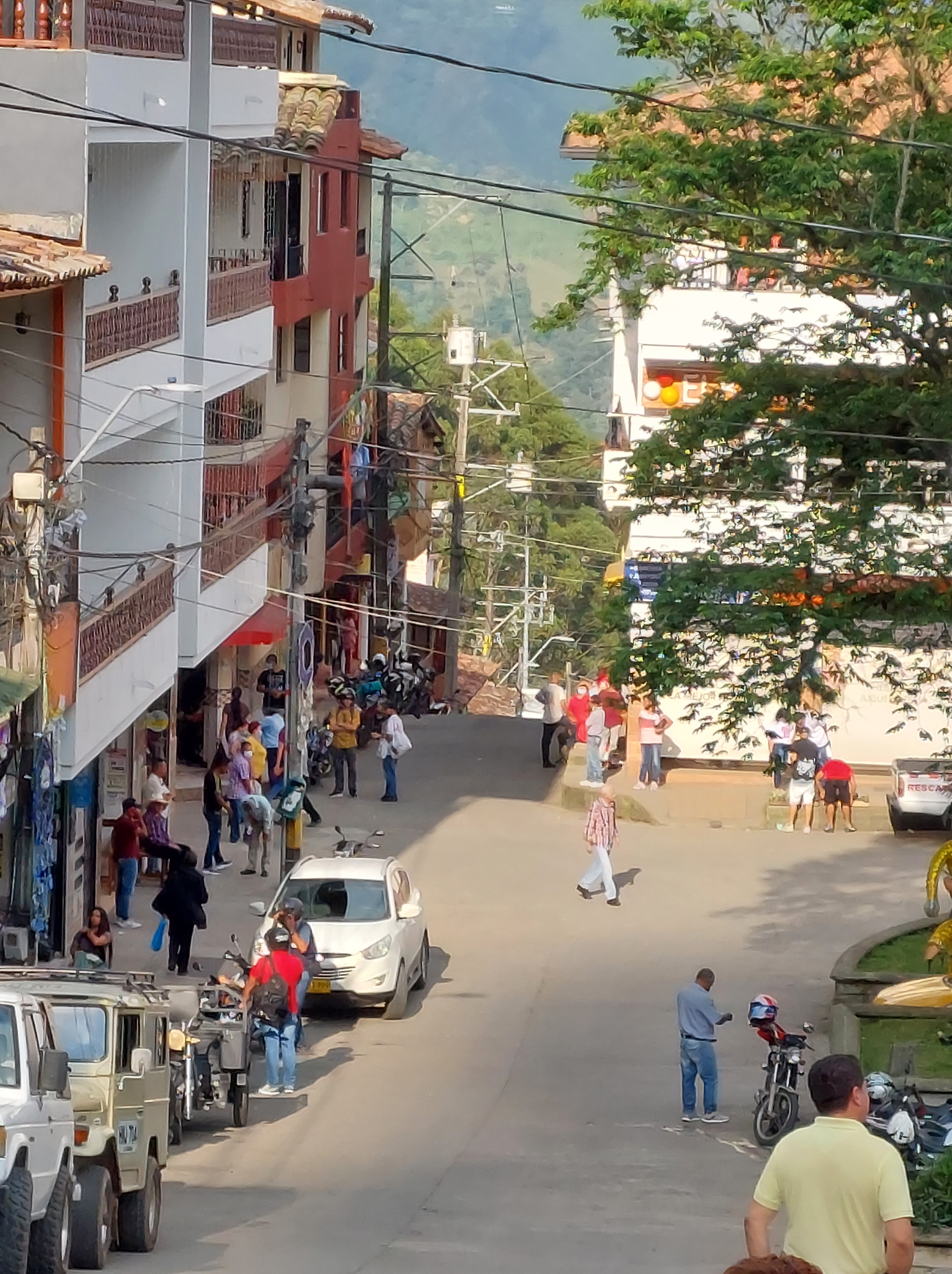 Faszinierende elektrische Installationen Es ist sehr bergig, bis ca. 60 Grad Steigung bzw. Gefälle Blick aus dem AutoDie ebenerdigen Fenster sind fast immer vergittert…das gibt Sicherheit El parque = der Platz im Zentrum Fredonia, ein Dorf 1,5 Stunden von Medellin entfernt
